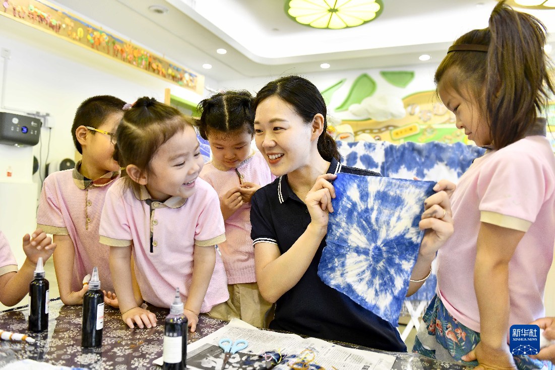5月30日,在山東省實(shí)驗(yàn)幼兒園,老師帶著孩子們體驗(yàn)扎染技藝。新華社記者 郭緒雷 攝