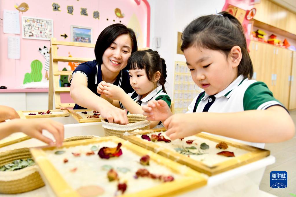 5月30日,在山東省實(shí)驗(yàn)幼兒園,老師帶著孩子們體驗(yàn)花草紙制作。新華社記者 郭緒雷 攝