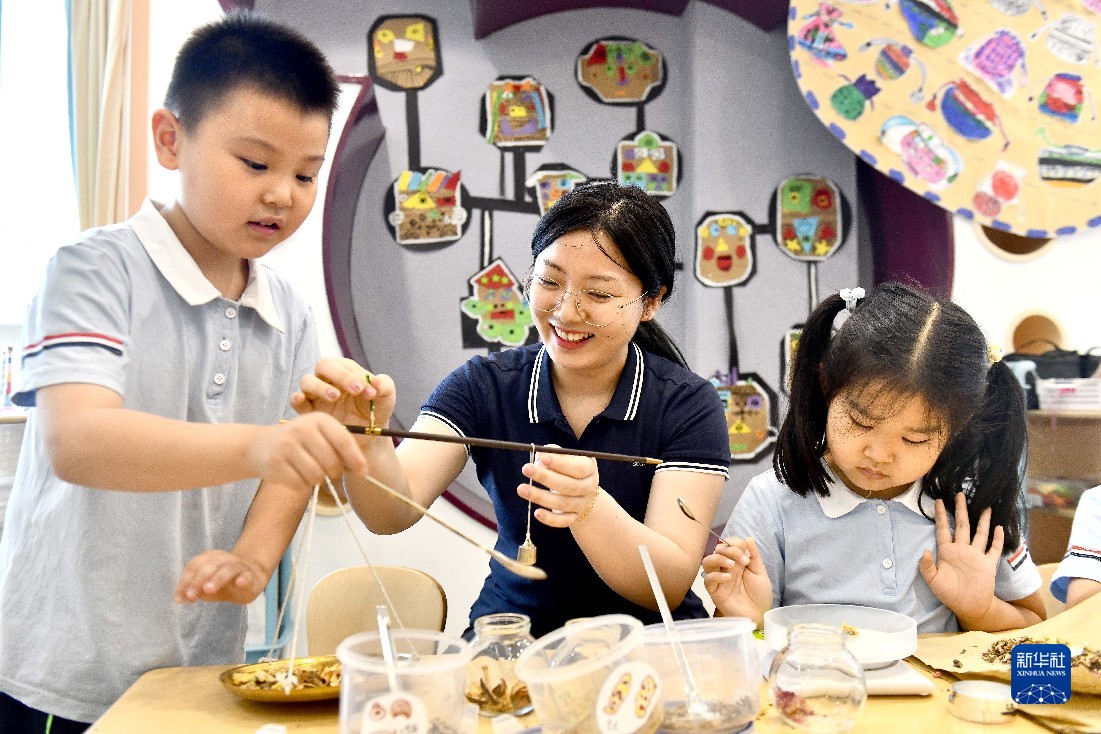 5月30日,在山東省實(shí)驗(yàn)幼兒園,老師帶著孩子們體驗(yàn)香囊制作。新華社記者 郭緒雷 攝