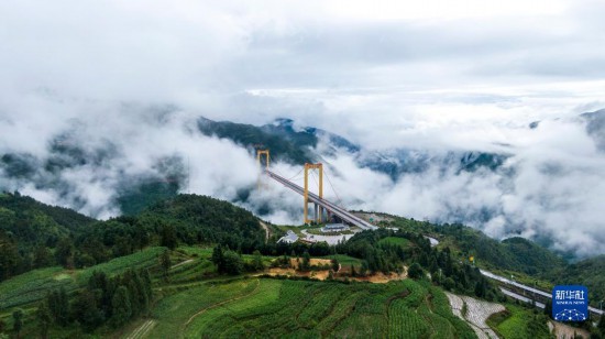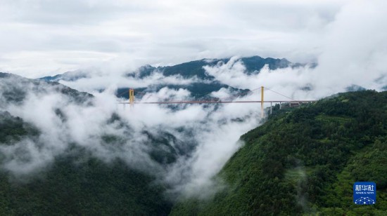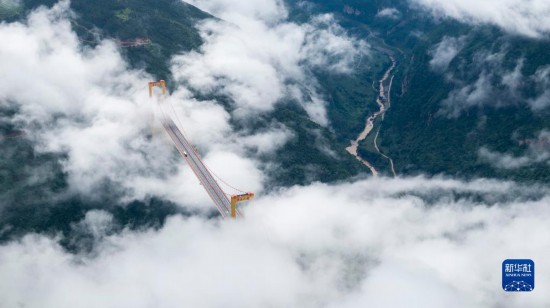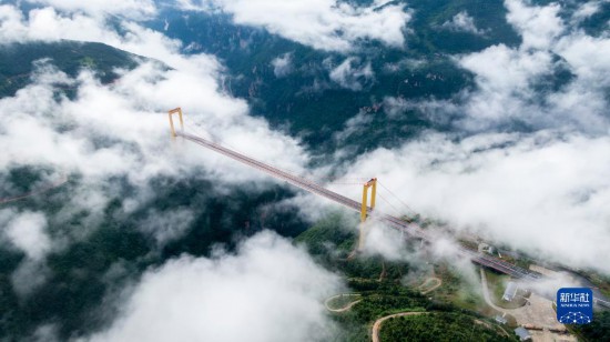 普立大橋位于云南省曲靖市宣威市,橫跨寶山、普立兩個鄉(xiāng)鎮(zhèn),是一座高速公路鋼箱梁懸索橋,全長1040米,橋面距離谷底達500米。大橋所在地山勢陡峭,六月當(dāng)?shù)赜昙旧介g云霧繚繞,黃色的大橋在云海之中若隱若現(xiàn),宛如建設(shè)在云層之上。