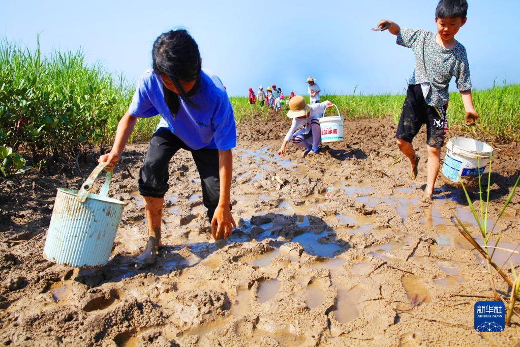 7月12日,浙江省溫嶺市塢根鎮(zhèn)灘涂研學(xué)基地,孩子們在灘涂挖尋小螃蟹等海涂生物。