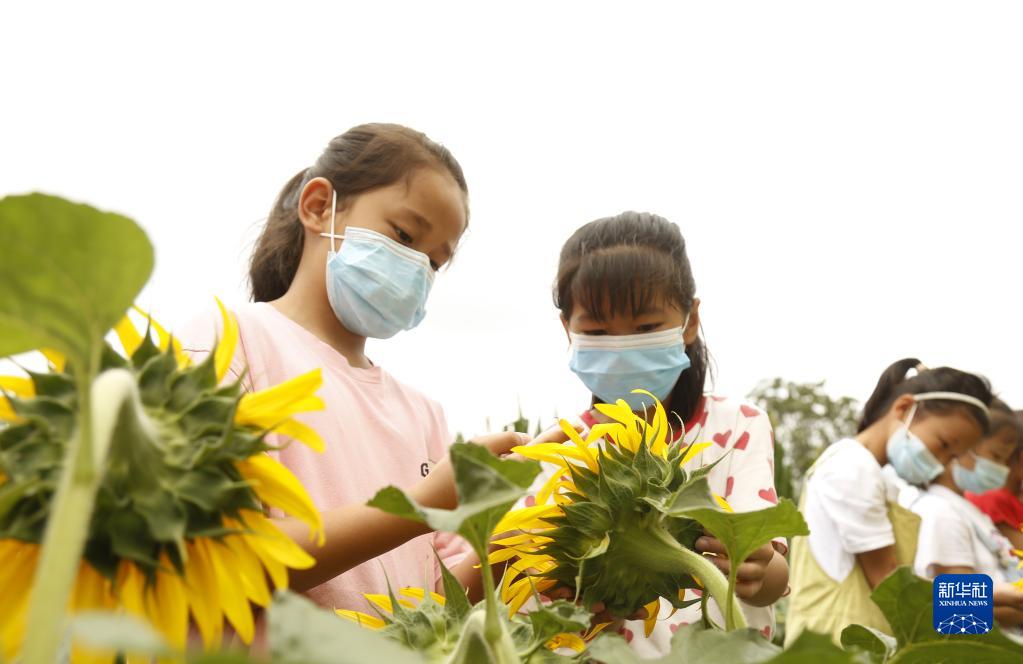 7月12日,在河北省邢臺(tái)市南康莊小學(xué)勞動(dòng)教育實(shí)踐基地,參加暑期活動(dòng)的孩子們觀察農(nóng)作物生長情況。
