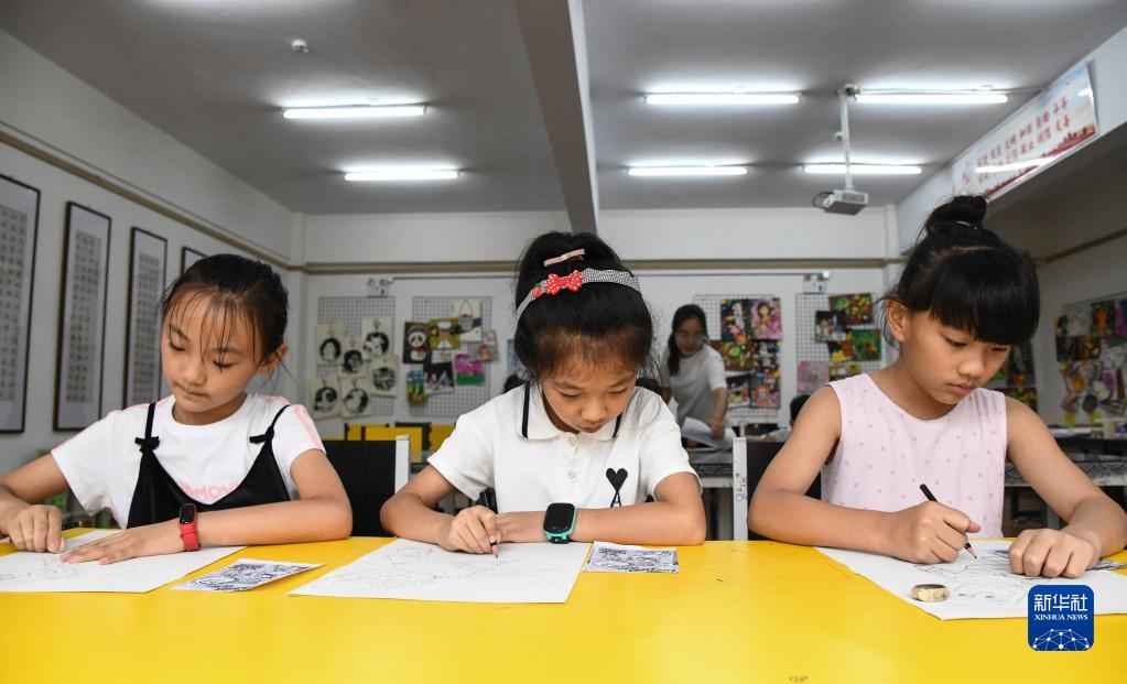 7月12日,在河南省濟(jì)源市國風(fēng)藝術(shù)培訓(xùn)學(xué)校,孩子們在練習(xí)繪畫。