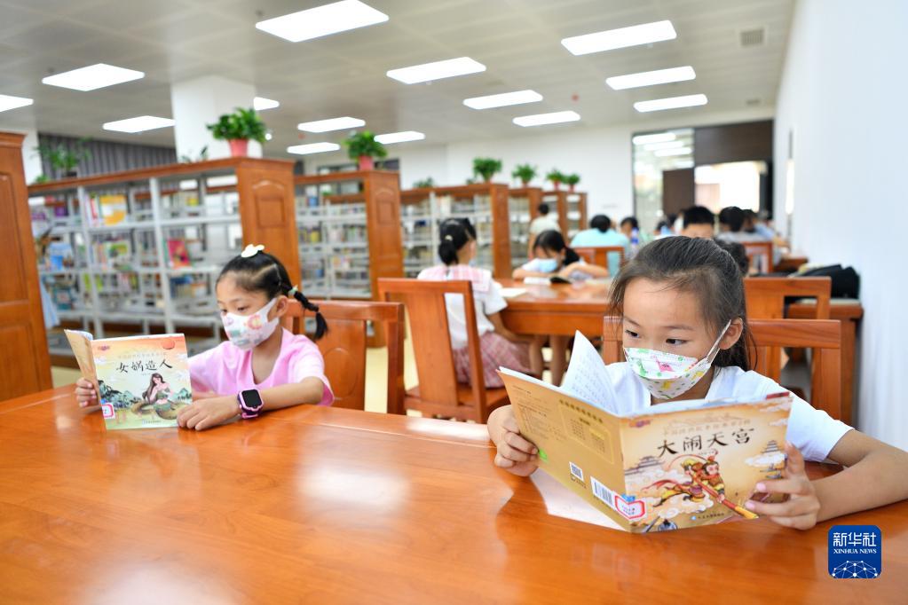 7月12日,在湖北省襄陽市??悼h圖書館少兒閱讀室,孩子們在閱覽圖書。