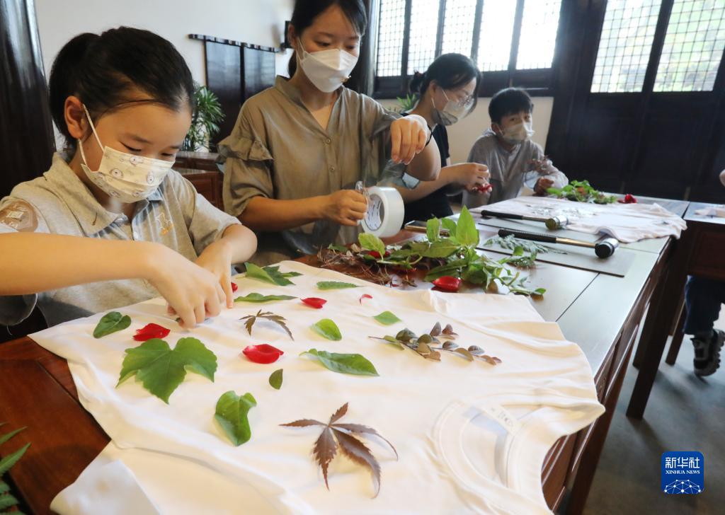 7月12日,在江蘇蘇州虎丘景區(qū),家長陪同小朋友在體驗(yàn)植物拓染。