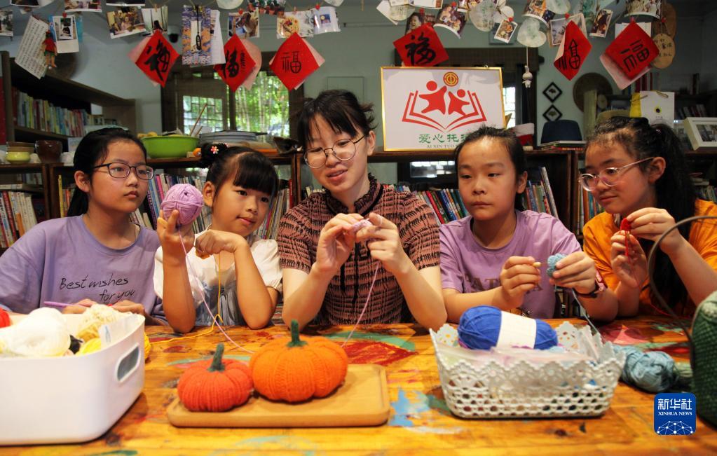 7月12日,浙江省臺(tái)州市路橋區(qū)新橋鎮(zhèn)金良社區(qū)兒童之家,小朋友在志愿者(中)輔導(dǎo)下學(xué)習(xí)毛衣編織。