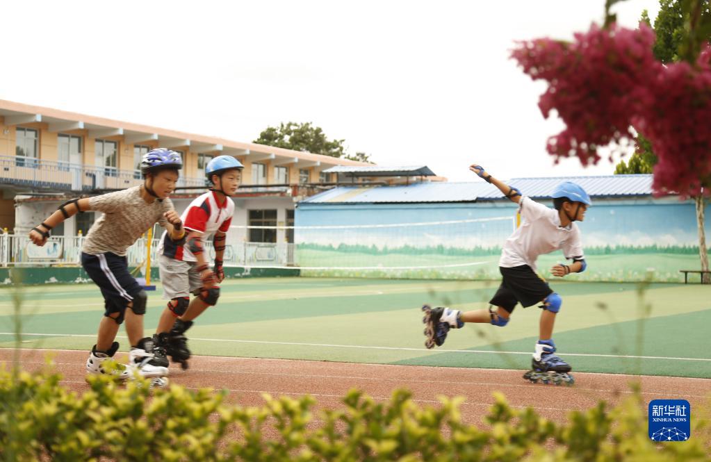7月12日,在河北省邢臺(tái)市南康莊小學(xué),參加暑期活動(dòng)的孩子們練習(xí)輪滑。