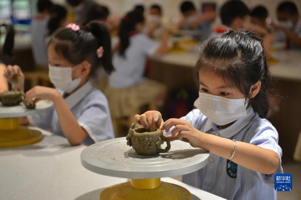 7月11日,河北省石家莊市柏林莊學(xué)校暑假托管班的小學(xué)生做陶藝。