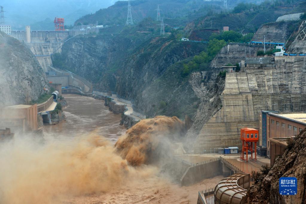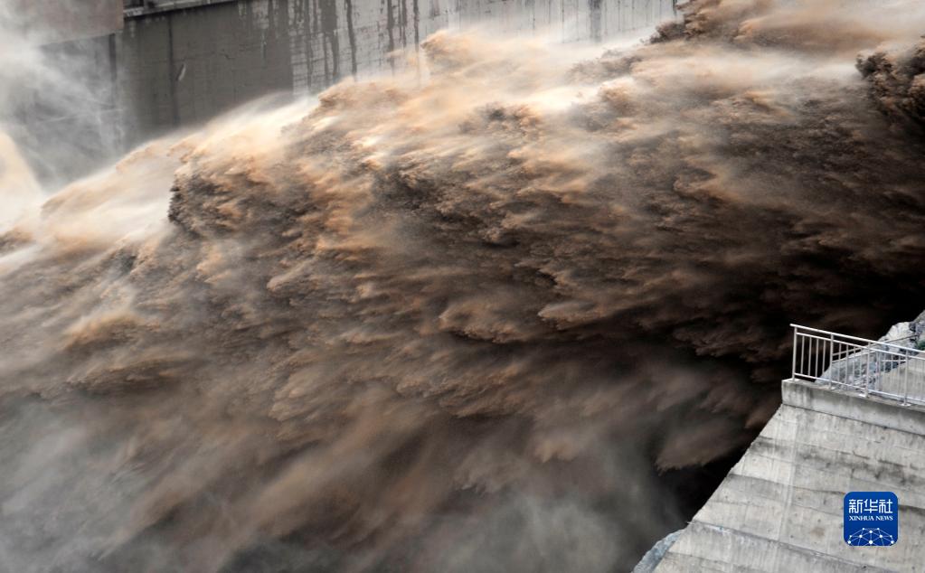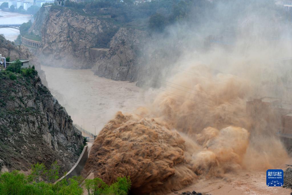 當(dāng)日,受強(qiáng)降水天氣影響,黃河劉家峽水庫來沙量急劇增加,劉家峽水庫按照調(diào)度要求進(jìn)行調(diào)水排沙。夾裹著大量泥沙的水流從排沙洞出口噴涌而出,場面壯觀。