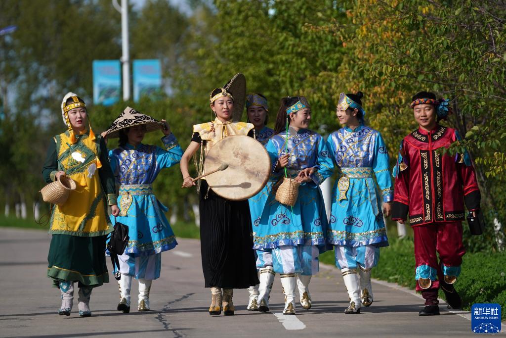 9月4日,在撫遠市烏蘇鎮(zhèn)抓吉赫哲族村,身著民族服裝的工作人員前往赫哲民俗展示館。