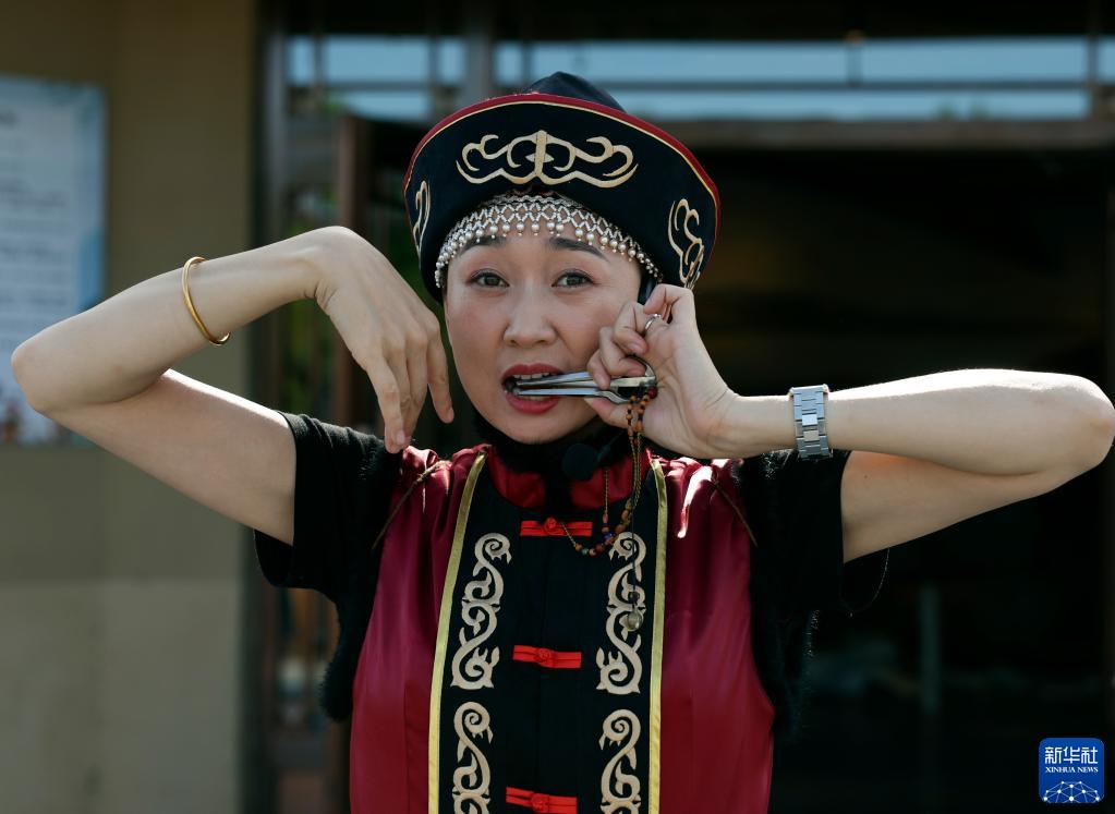 9月4日,在撫遠市烏蘇鎮(zhèn)抓吉赫哲族村赫哲民俗展示館,工作人員在表演口弦琴。