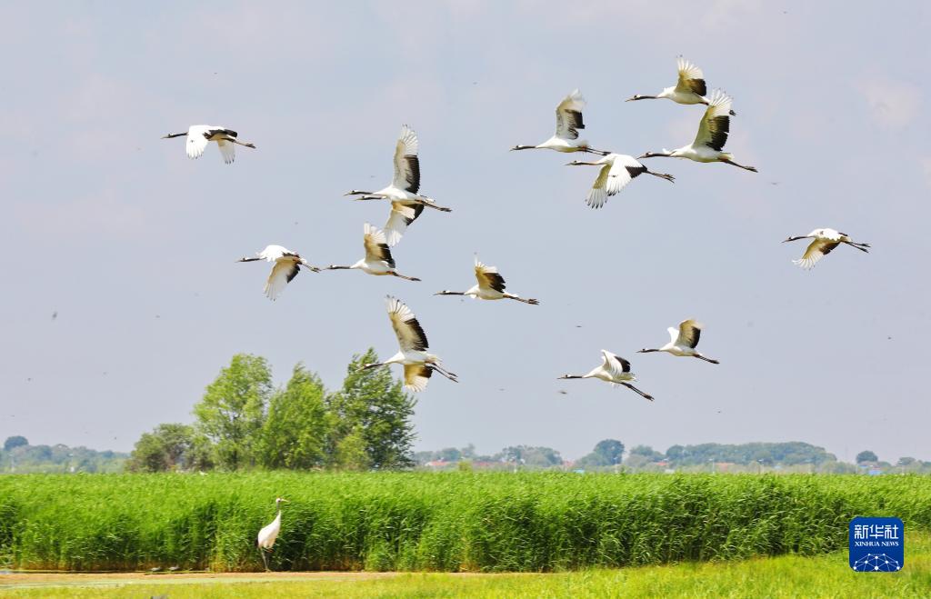 丹頂鶴在黑龍江扎龍國(guó)家級(jí)自然保護(hù)區(qū)自由翱翔(2022年6月15日攝)。 新華社發(fā)(宋燕軍 攝)