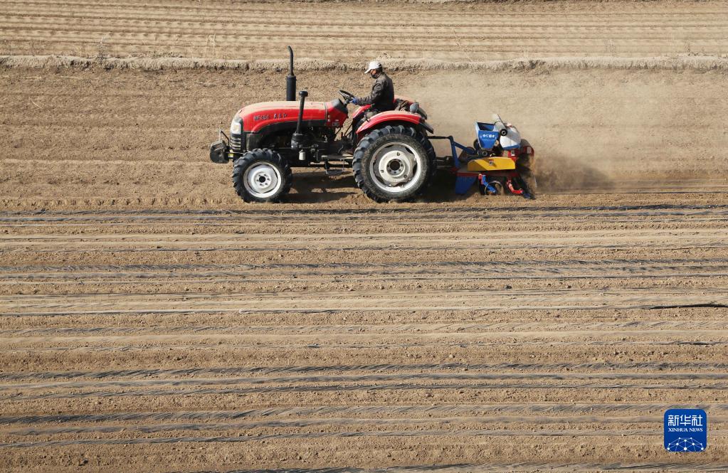 11月7日,甘肅省定西市安定區(qū)巉口鎮(zhèn)松川村,農(nóng)民駕駛農(nóng)機(jī)覆地膜。