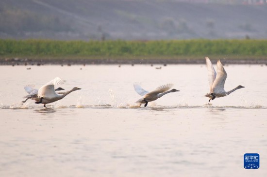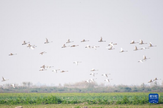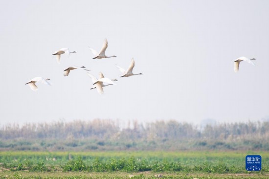 11月10日,小天鵝在湖南西洞庭湖濕地上空飛翔。