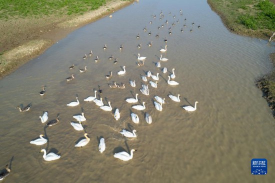 這是11月10日在湖南西洞庭湖濕地拍攝的小天鵝和灰雁(無人機(jī)照片)。