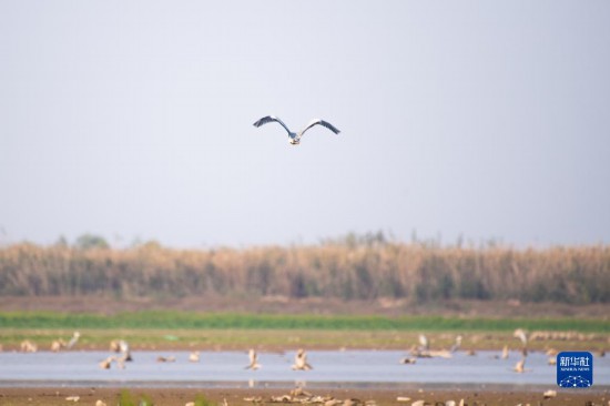11月10日,一只蒼鷺在湖南西洞庭湖濕地上空飛翔。