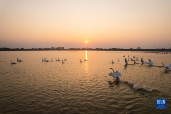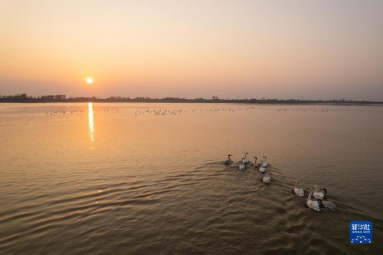 這是11月10日在湖南西洞庭湖濕地拍攝的夕陽和候鳥。