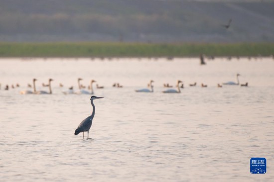 11月10日,一只蒼鷺在湖南西洞庭湖濕地水面休憩。