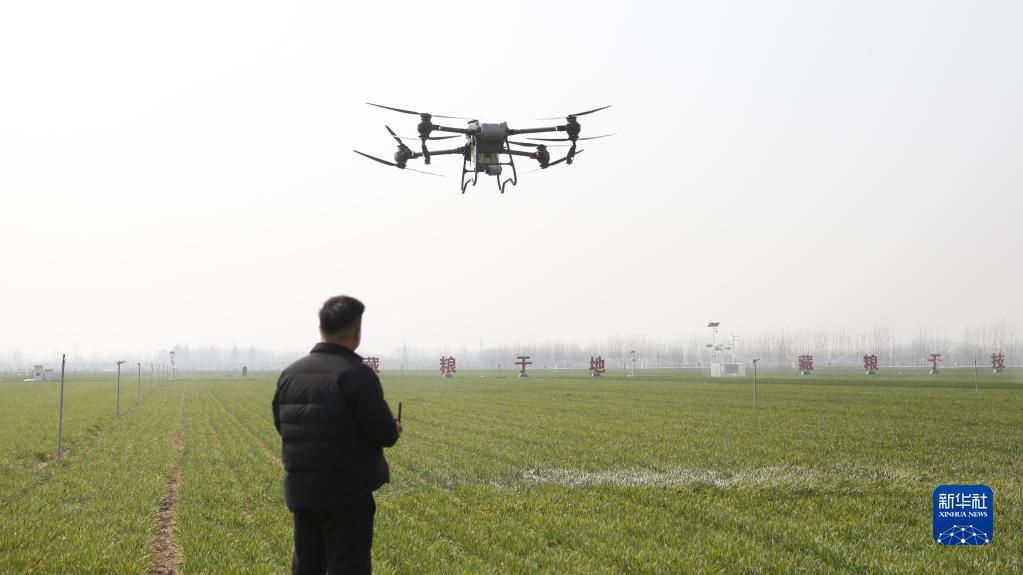 3月2日,河南省尉氏縣張市鎮(zhèn)農(nóng)民用植保無(wú)人機(jī)在田間為小麥噴灑葉面肥。