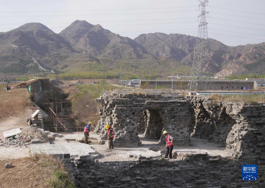 4月19日,工人在山海關(guān)長(zhǎng)城北翼城修繕工程工地施工。