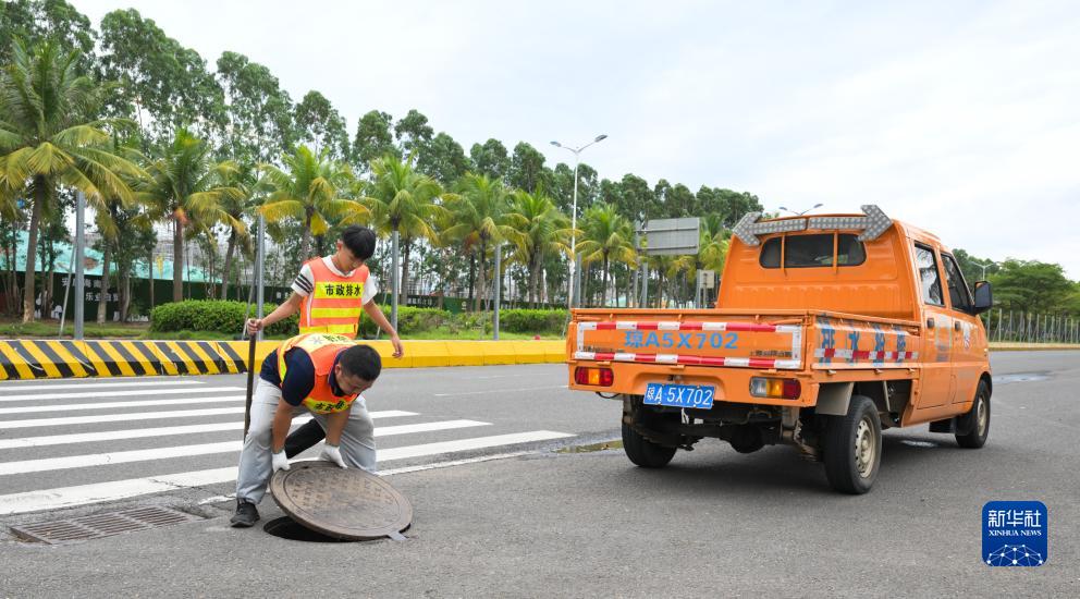 7月17日,在??谑袨I海大道,工作人員在檢查排水設(shè)施。