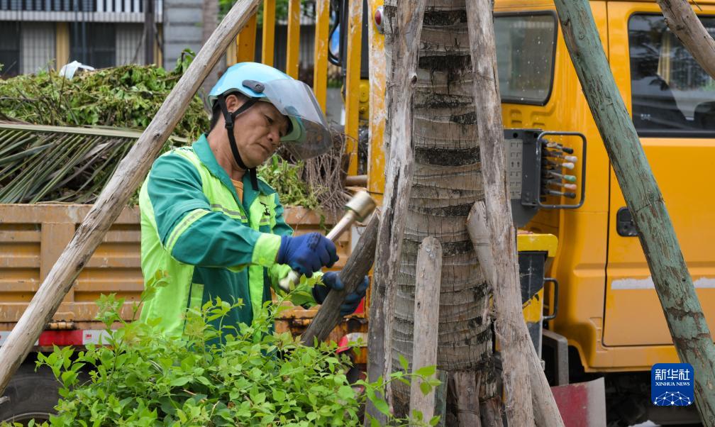 7月17日,在??谑行潞4蟮溃ぷ魅藛T對樹木進(jìn)行加固。