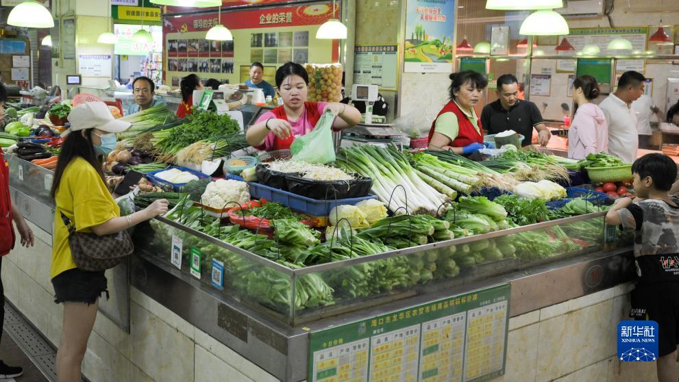 7月17日,在??谑薪鹳Q(mào)文華農(nóng)貿(mào)市場,市民有序選購蔬菜。