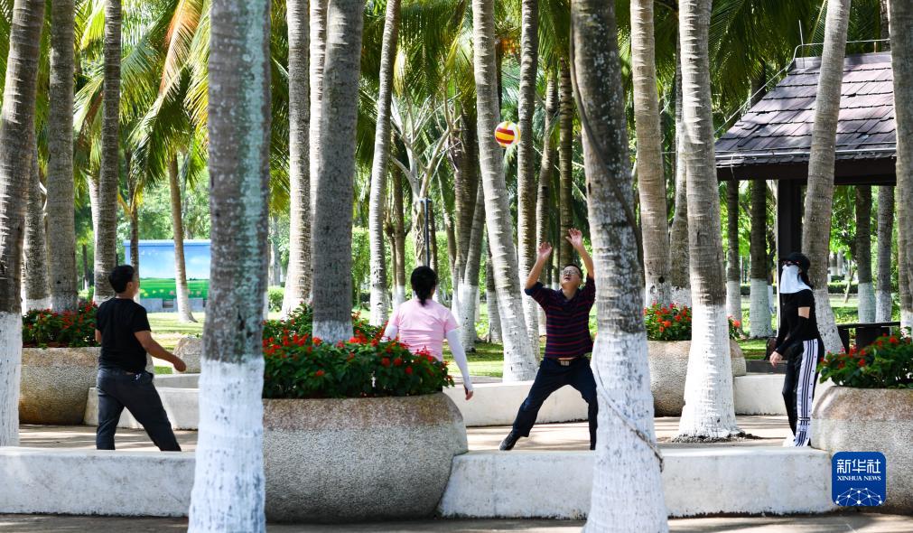 市民在??谑腥f(wàn)綠園內(nèi)打排球(2022年4月5日攝)。