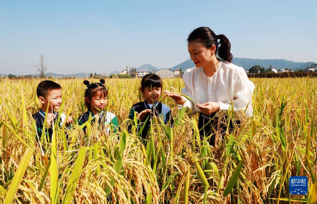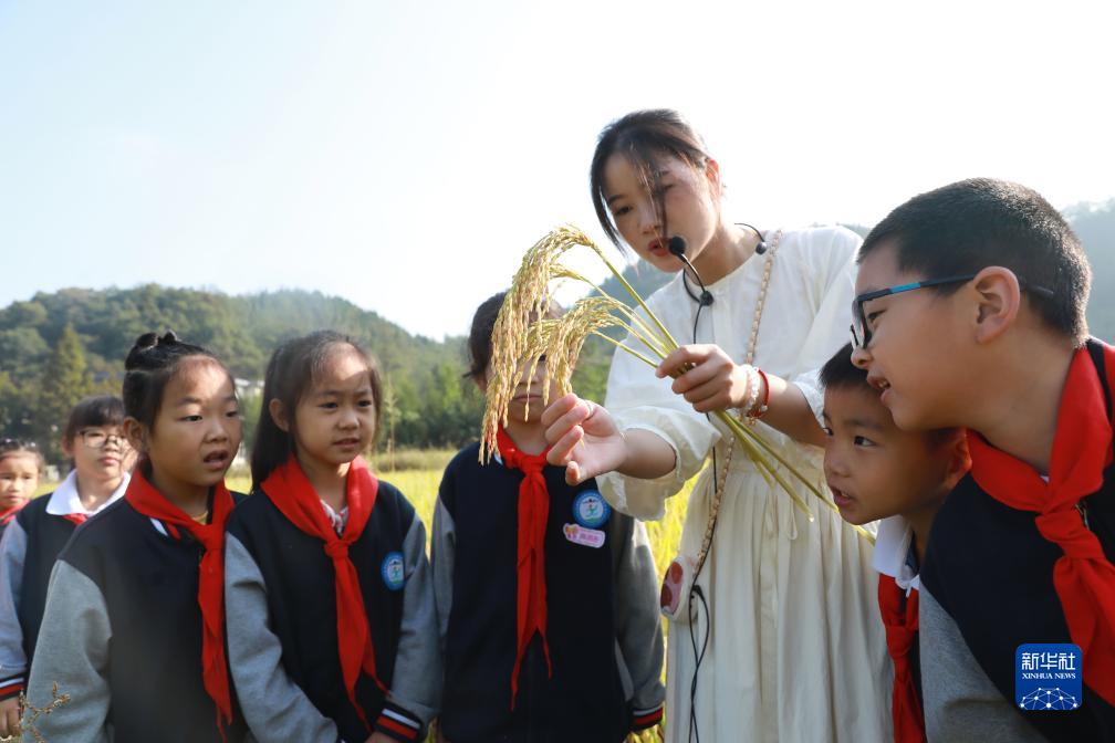 10月16日,浙江省杭州市臨安區(qū)天目山鎮(zhèn)藻溪小學(xué)學(xué)生在老師的帶領(lǐng)下學(xué)習(xí)水稻知識(shí)。