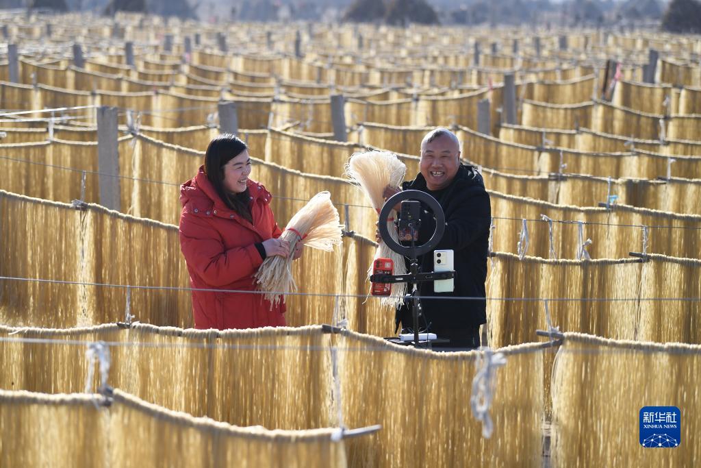 12月6日,河北省遷安市夏官營鎮(zhèn)梁龐莊村村民在當(dāng)?shù)匾惶幏蹢l晾曬場直播推介粉條。