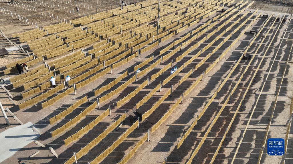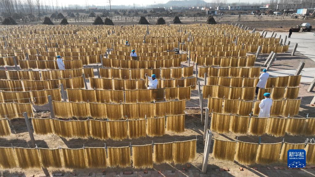 12月6日,河北省遷安市夏官營鎮(zhèn)梁龐莊村一家粉條加工企業(yè)的工人在晾曬粉條(無人機照片)。