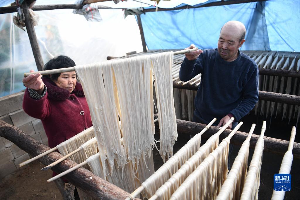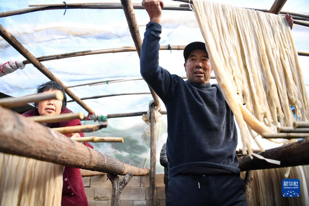12月6日,河北省遷安市五重安鎮(zhèn)茶井溝村的村民在晾曬剛制作好的粉條。