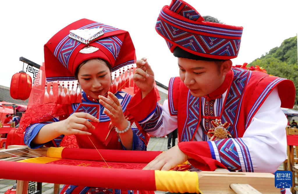 5月20日,在廣西忻城縣“520”集體婚禮現(xiàn)場(chǎng),一對(duì)新人一起繡婚書。