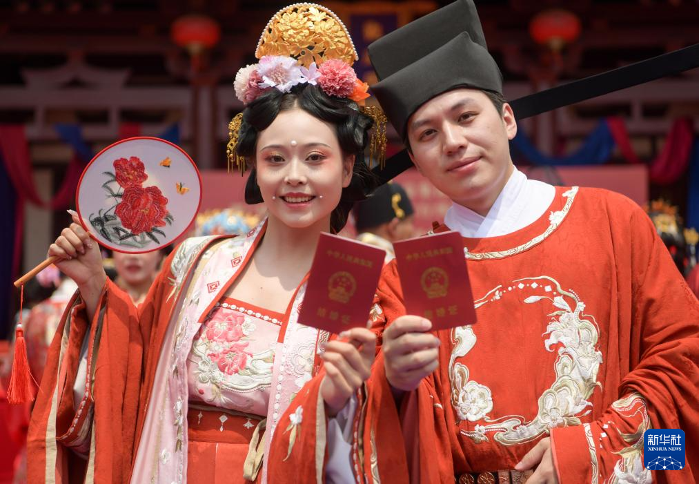 5月20日,在河南省洛陽(yáng)市上陽(yáng)宮,參加公益集體傳統(tǒng)婚禮的一對(duì)新人展示自己的結(jié)婚證。