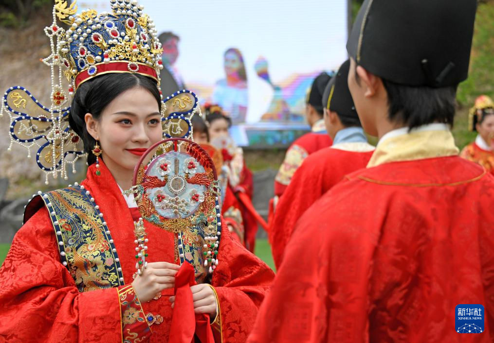 5月20日,在浙江省臺(tái)州市仙居縣神仙居景區(qū)南天頂,新人參加宋韻集體婚禮。