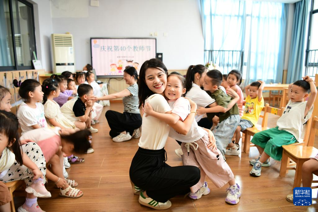 9月10日,在浙江省建德市更樓中心幼兒園,小朋友擁抱老師。