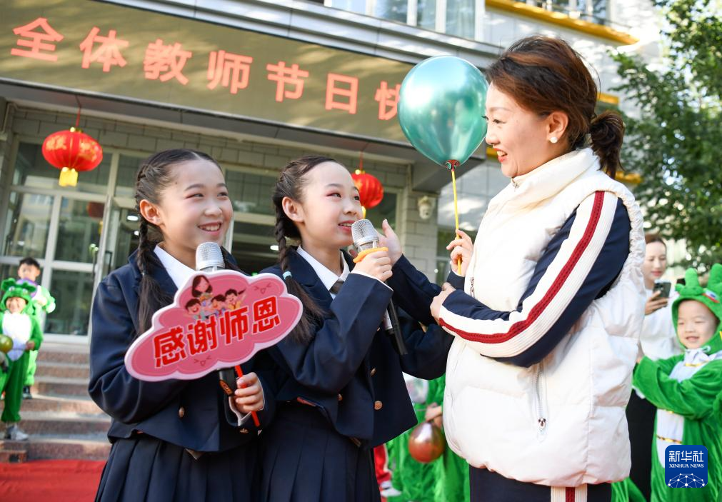 9月10日,在新疆教育學(xué)院實驗小學(xué)校園,學(xué)生為老師獻歌送上祝福。