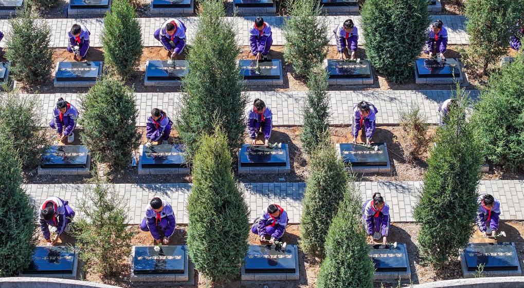 4月2日,河北省遵化市地北頭鎮(zhèn)學(xué)生在魯家峪烈士陵園向無名烈士獻花(無人機照片)。