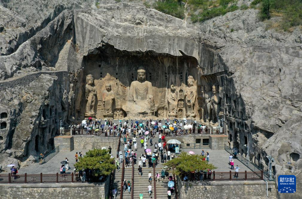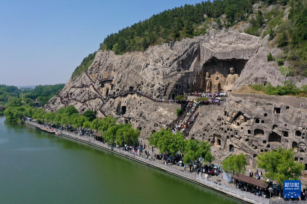 5月20日,游客在龍門石窟游玩(無(wú)人機(jī)照片)。
