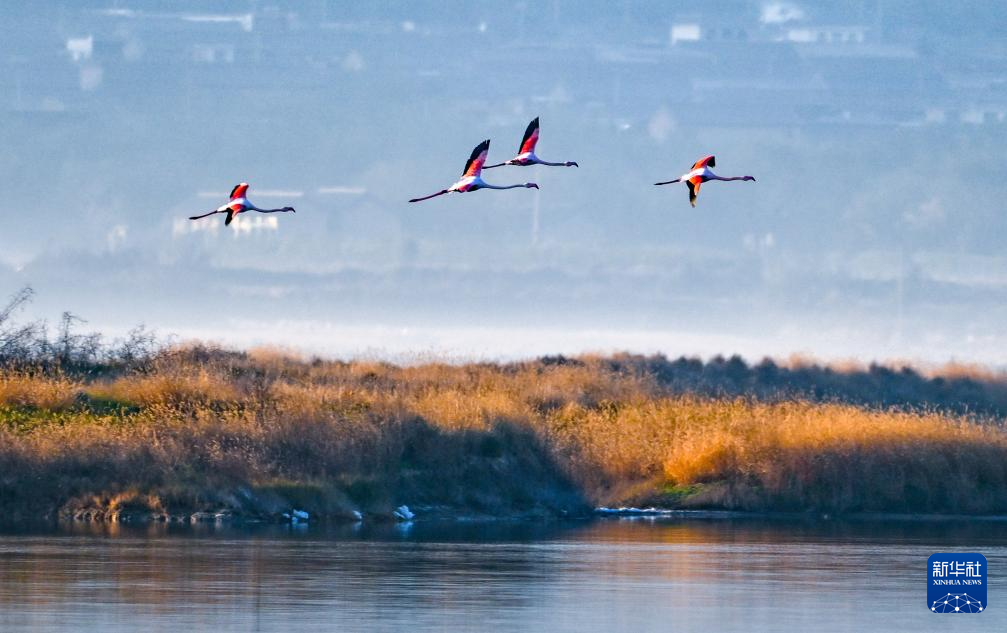 11月19日,火烈鳥在山西省運城鹽湖濕地飛翔。